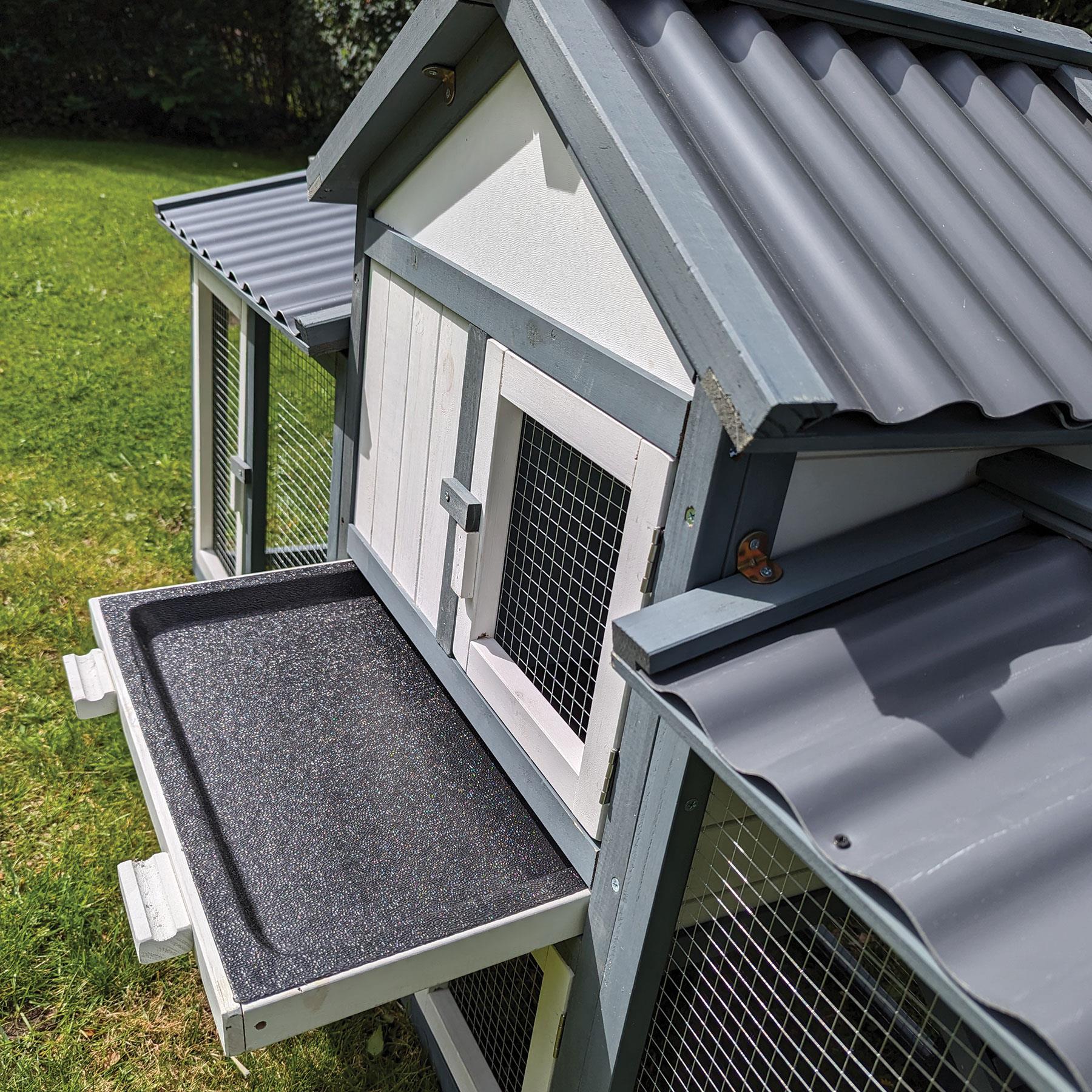 Die Reinigung ist ein Kinderspiel dank der innovativen Schublade mit Kunststoffwanne. Mühelos und zeitsparend halten Sie den Stall sauber, während Ihre Tiere in die oberste Etage über eine komfortable Treppe gelangen – ihre eigene Ruhezone. Auf der Seite der Treppe lässt sich der Stall mit einer kleinen Schiebetür schließen.