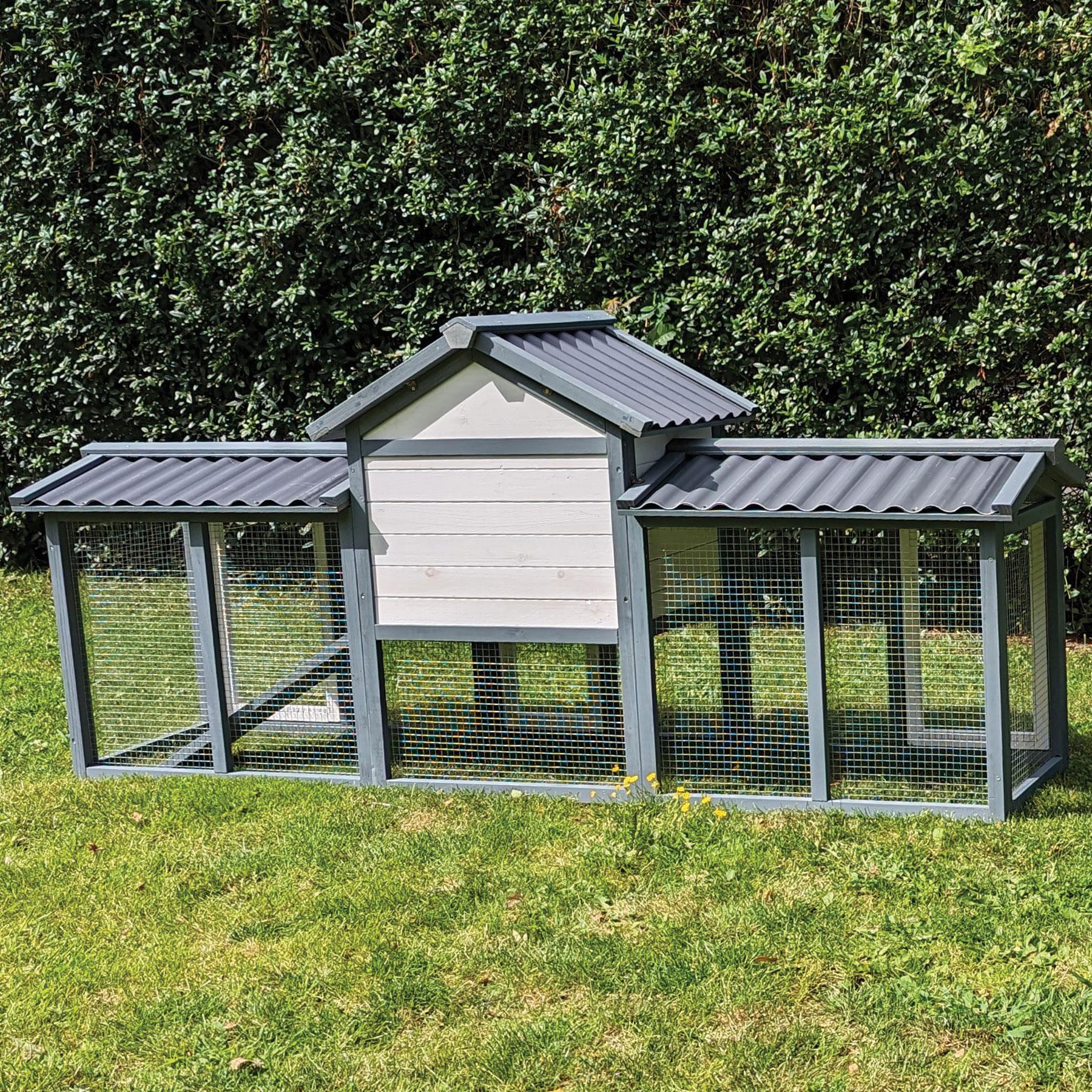 Zoo-XXL hat den Stall aus hochwertigem Kiefernholz gefertigt und bereits ungiftig gegen Feuchtigkeit imprägniert. Das atemberaubende graue PVC Welldach schützt Ihre Tiere vor Nässe, während der verzinkte Draht Sicherheit gegen Fuchs & Co. schafft. Mit Türen für den Hasenstall und beide Ausläufe ist problemlose Zugänglichkeit gewährleistet.